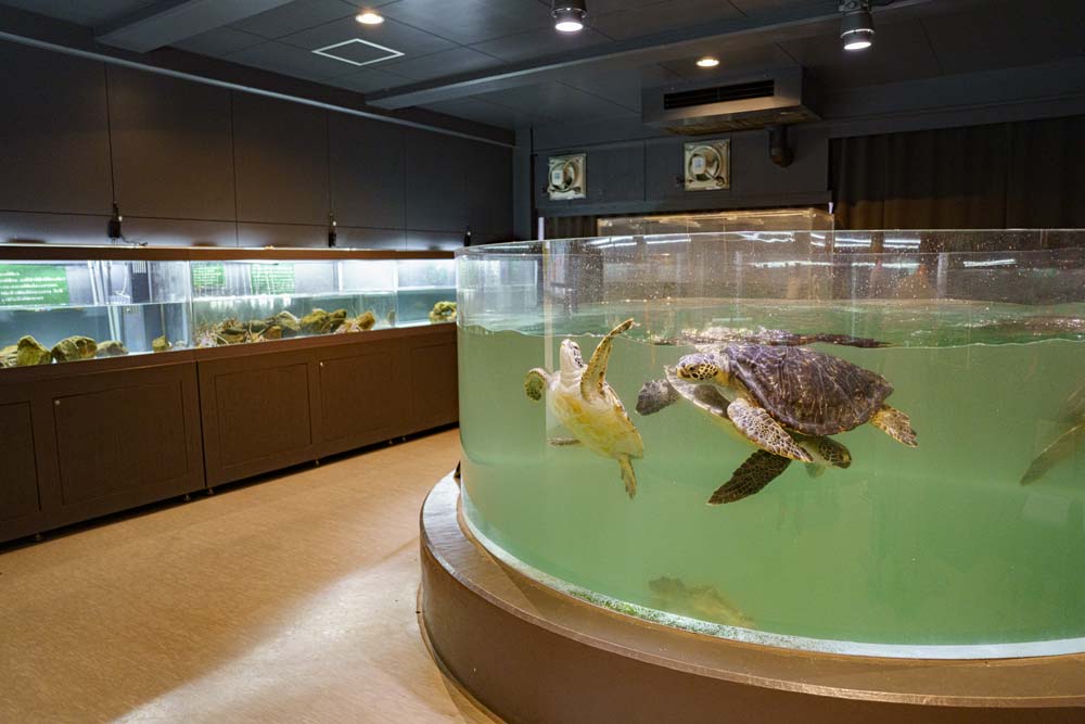 旧小学校を改修した水族館です。通常の展示に加えて、跳び箱や手洗い場の水槽、理科室には骨格標本があるなど、学校ならではの設備を生かした展示が盛りだくさんです。教科書や楽器もあり、懐かしい気持ちになります。屋外のプールでは、カメやサメが泳いでいます。