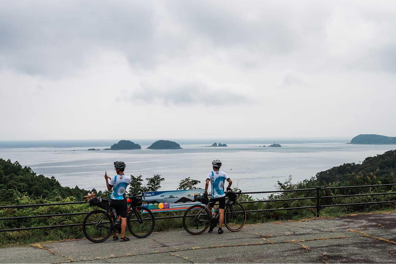 第四展望台に到着する。眼下に広がる海と山のコントラストが、苦しい道のりを越えた達成感を強く刻みつけた。「行くか!」「行きましょう!」――気合いを込めて宿への道へと漕ぎ出していった。