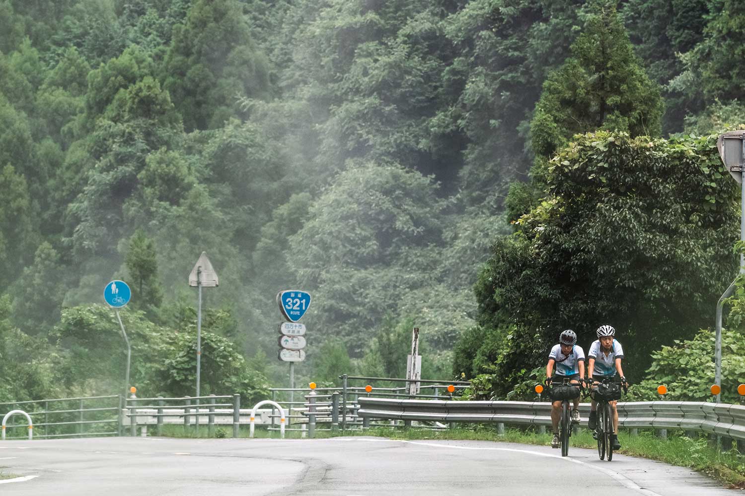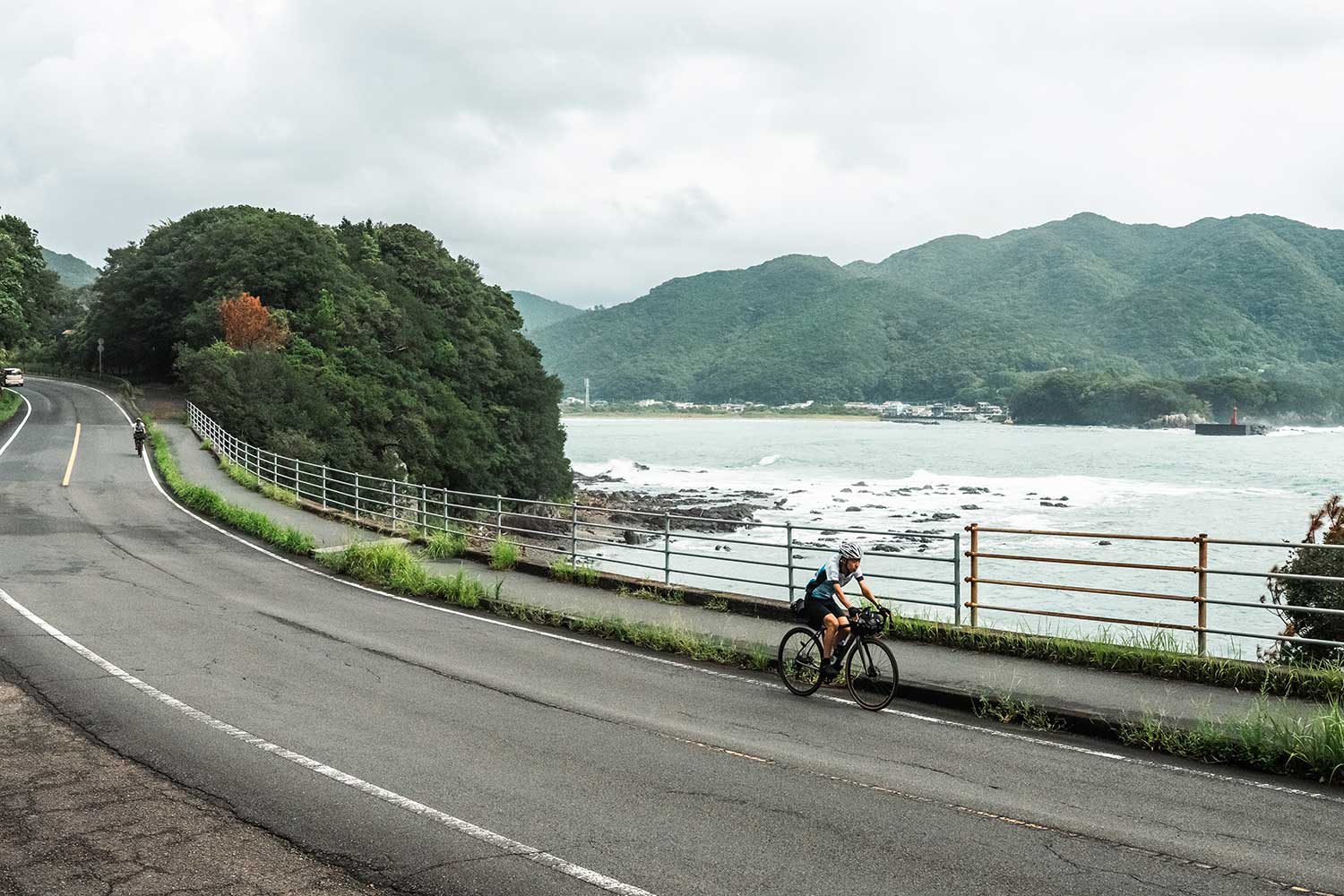叶岬を越えて山間部へ。ゆるやかだが長い9キロの登りが続く。太ももに筋肉痛を抱える佑輝さん、ふくらはぎに湿布を貼る俊介さん。これまでで最も厳しい区間だ。だが俊介さんが前を走り、佑輝さんを引っ張る。その背中には、先輩としての責任と、仲間を思う優しさがにじんでいた。
