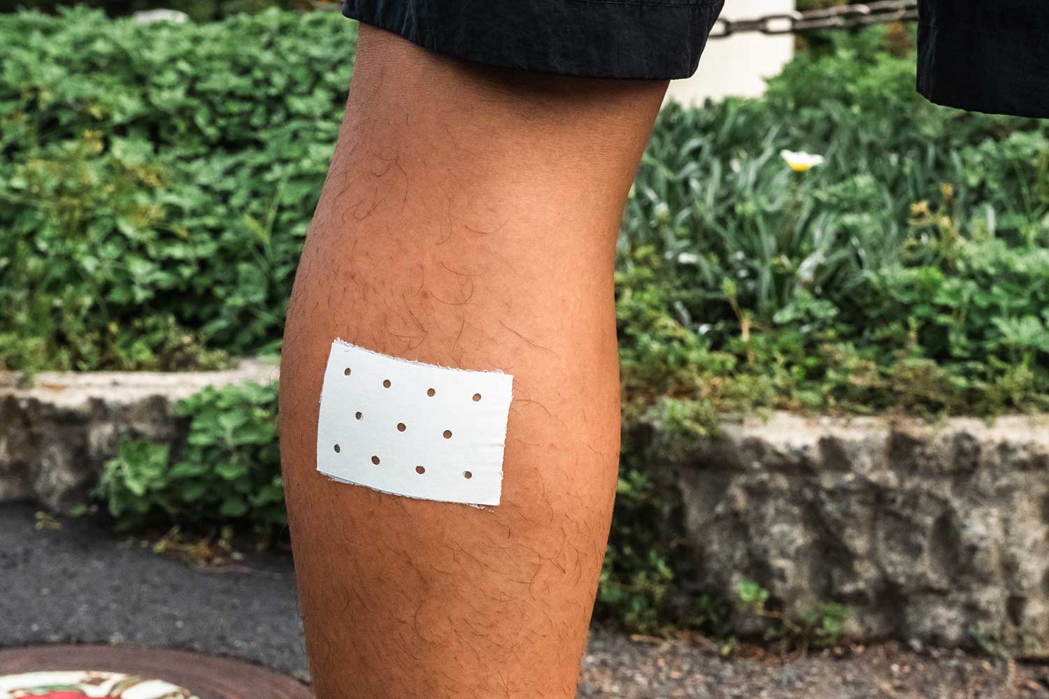 疲労が蓄積している俊介さんの脚には湿布が貼られていた