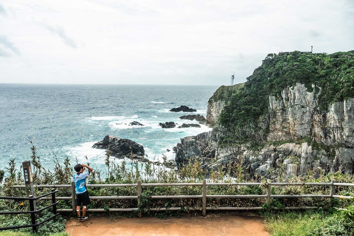 足摺岬を望む展望台からシャッターを押す俊介さん