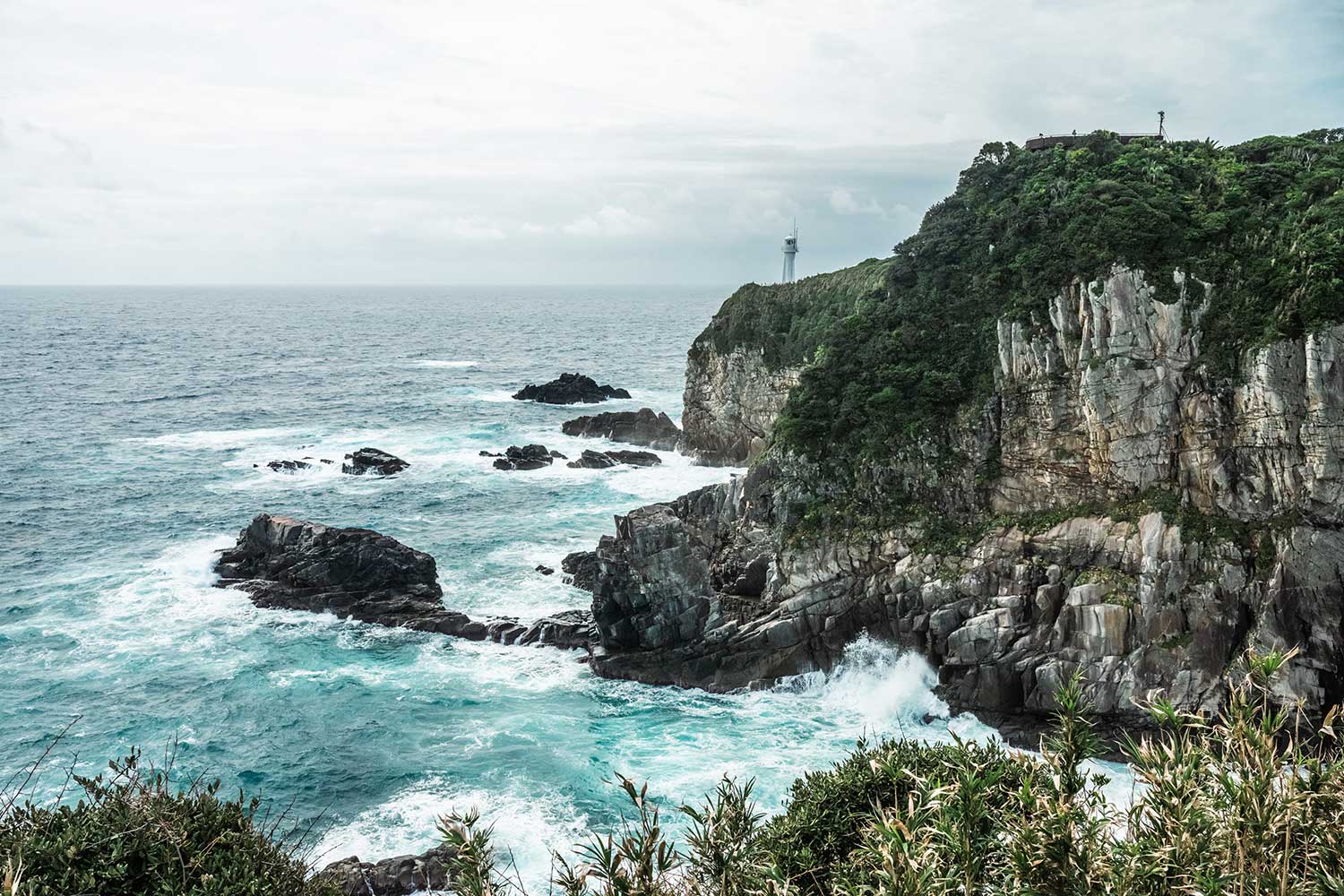 波に打たれる岬の荒々しい様子、自然の厳しいさまを肌で感じる