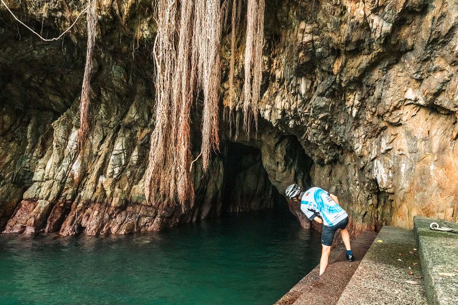 小さな漁村、松尾漁港の「海老洞」は独特な雰囲気を醸す洞窟。自転車だから見られる景色があった